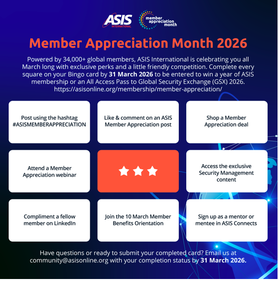 This March, we’re celebrating you with our Member Appreciation Bingo — a fun and engaging way to explore exclusive benefits, connect with fellow members, and make the most of your ASIS membership. Visit our Member Appreciation Month page to download your card, review the rules, and start playing today.